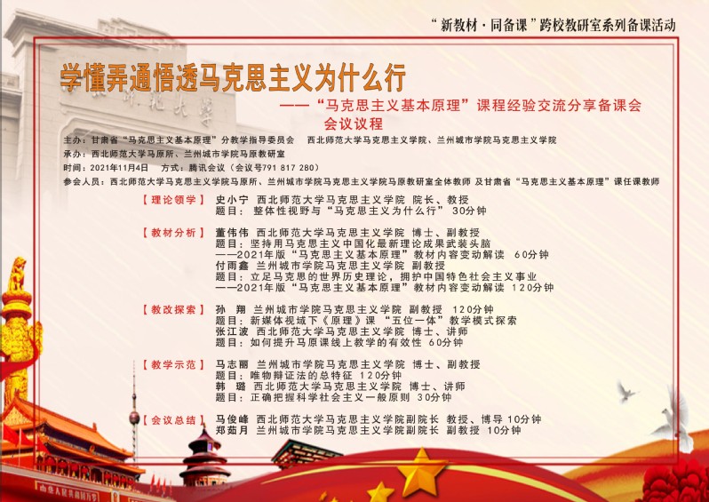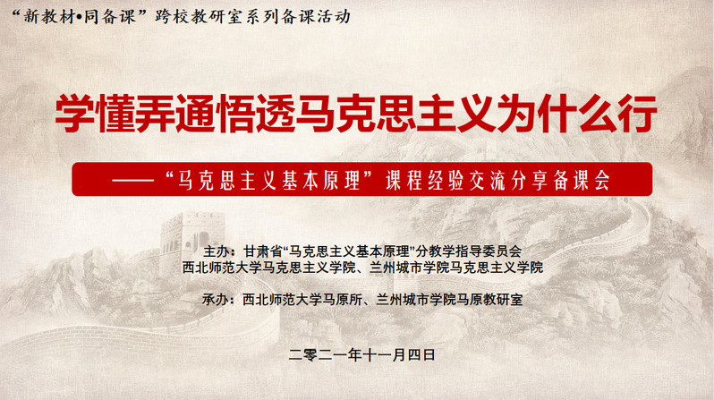 2021年11月4日下午,由甘肃省“马克思主义基本原理”分教学指导委员会,必赢565net官网、兰州城市学院必赢565net官网联合主办,必赢565net官网马原所、兰州城市学院马原教研室具体承办的“学懂弄通悟透马克思主义为什么行——‘马克思主义基本原理’课程经验交流分享备课会”顺利召开。此次集体备课会为“新教材•同备课”跨校教研室系列备课活动之一。由于疫情原因,此次会议以线上形式开展。