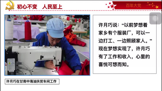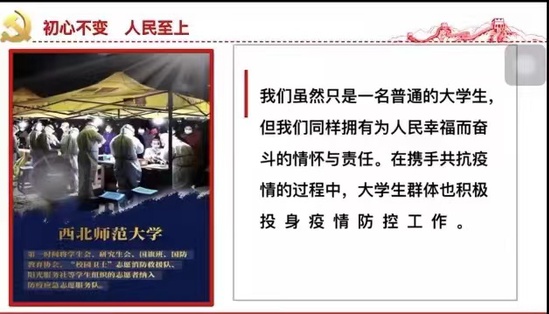 宣讲团成员马冰以《不忘初心,人民至上》为题,分享了红军长征在甘肃哈达铺鱼水情深的军民故事、脱贫攻坚给她的家乡甘南带来的巨大变化。马冰同学深情地说:“中国共产党一路走来,一路怀揣着人民至上的初心,一路为人民做好事、做实事,中国共产党以自己的模范行动,赢得了人民群众的真心拥护”,而这样的初心也正是无数党员志愿者倾力倾情冲在抗击疫情第一线的精神动能。