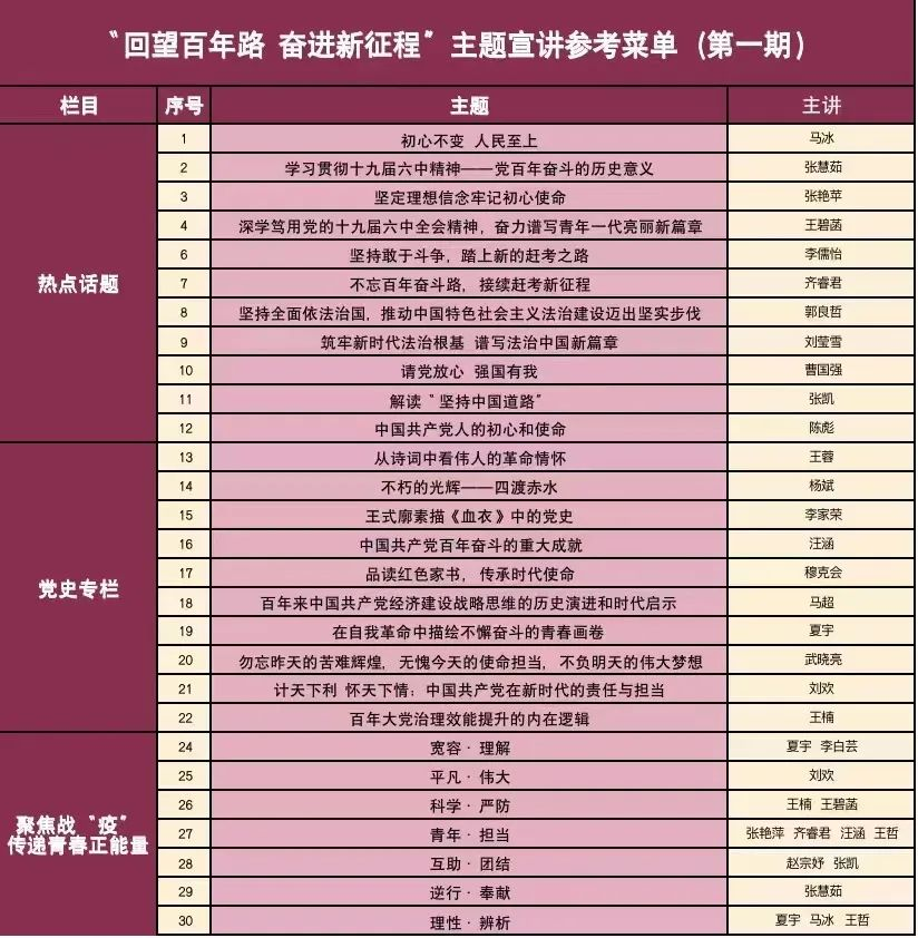 宣讲团面向全校党团组织和校外组织开放预约,主要所承担的宣讲任务包括党团教育活动、班团主题活动、基层主题学习等。目前形成了如下宣讲目录,供预约选择: