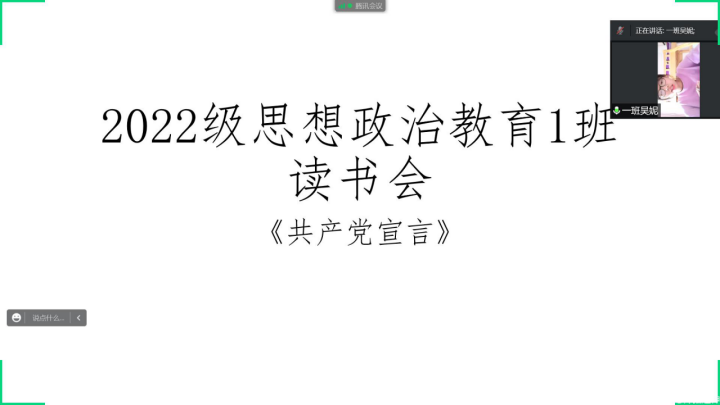 10月6日下午3:00,2022级思想政治教育1班“明德”读书会第1期通过腾讯会议的方式在线上展开。由于已返校同学尚在军训,此次读书会主要面向未返校同学。本次读书会由2022级思政1班学业班主任姜潭老师主持,阅读的书目是《共产党宣言》,阅读的范围是正文部分。读书会伊始,姜谭老师强调了开展读书会的意义和目的,然后为大家讲解阅读范围界定的合理性和本次读书会的流程。