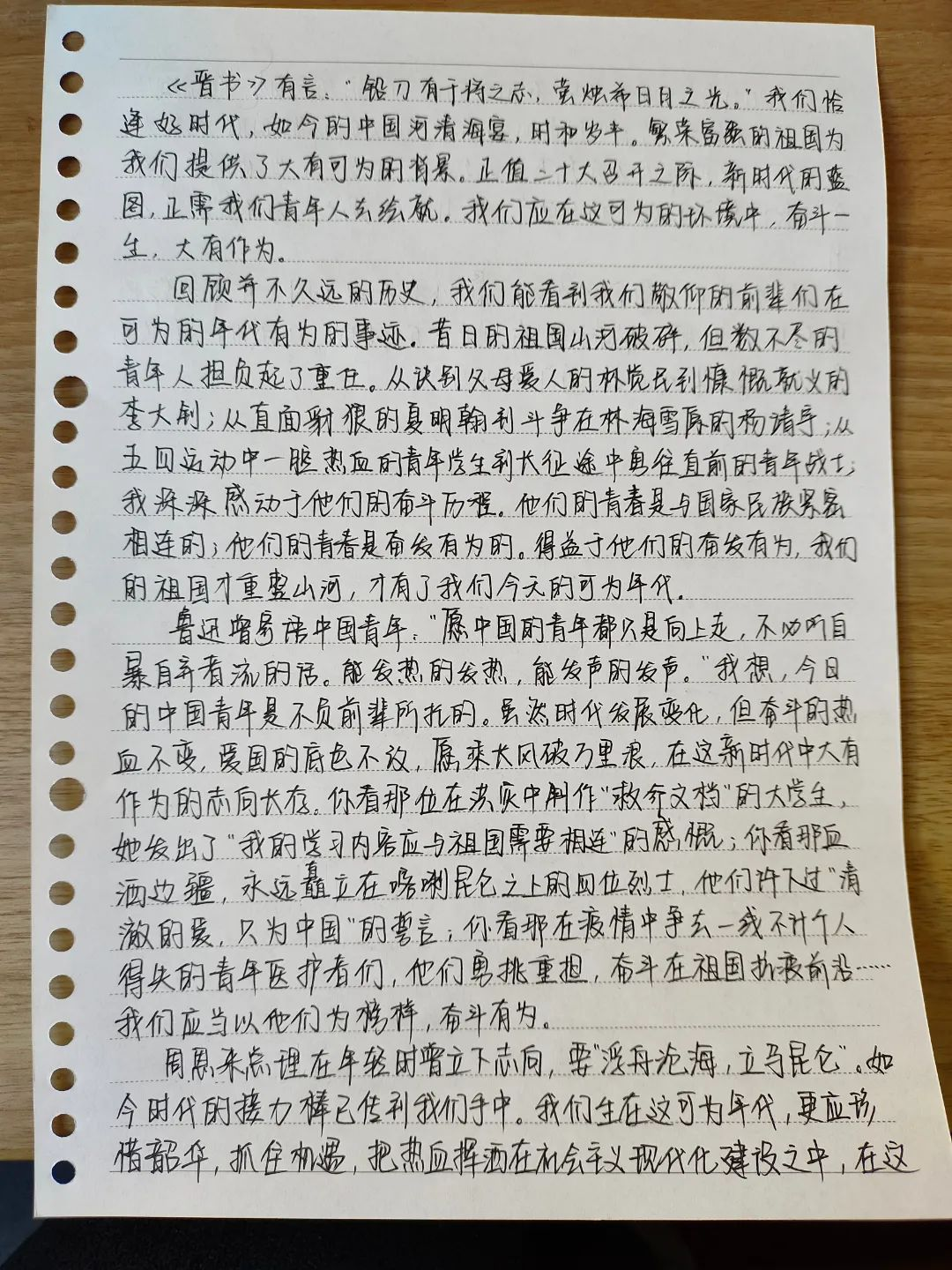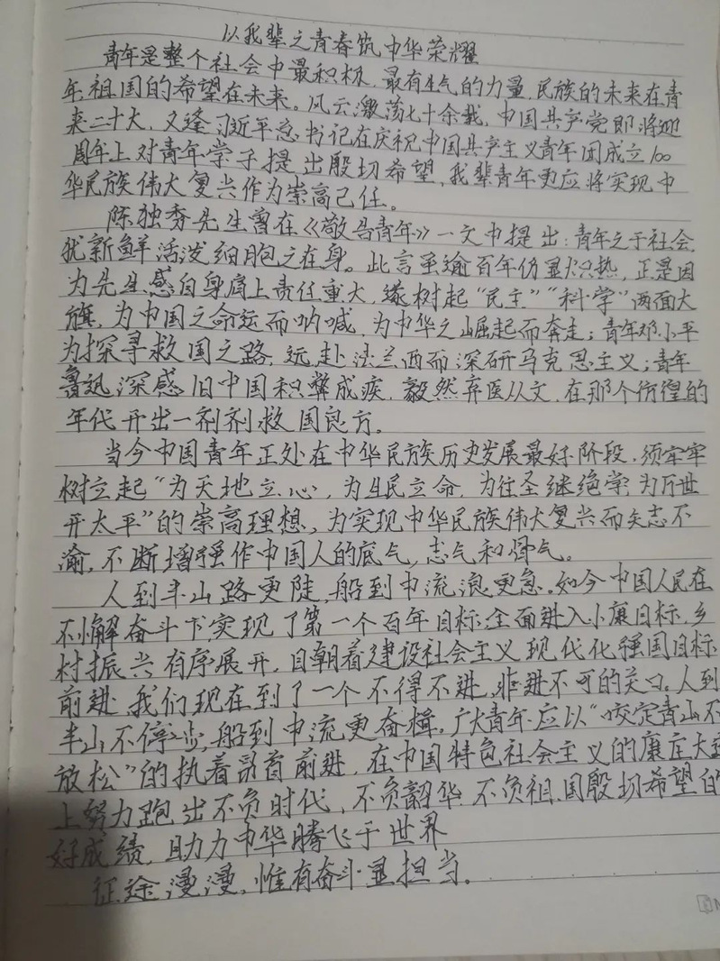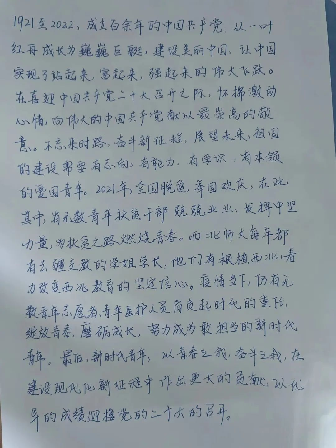 常玉霞同学认为,作为新时代青年,我们要以青春之我,奋斗之我,在建设社会主义现代化国家新征程中做出更大的贡献,以优异的成绩迎接党的二十大胜利召开。