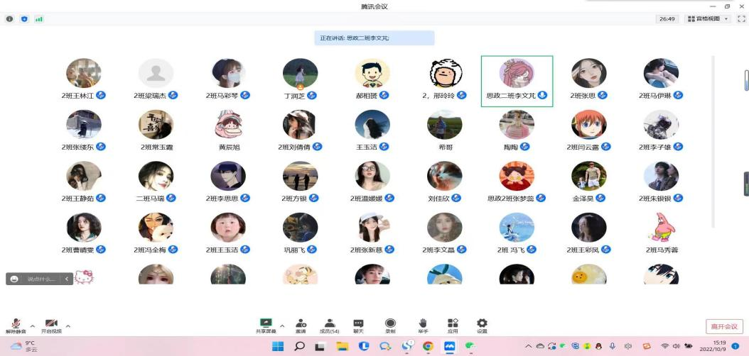 10月9日下午,必赢565net官网2022级思政2班召开了以“青春献礼二十大,强国有我新征程”为主题的线上读书会。此次会议由丁润芝同学主持,参会人员有郝相赟老师、李颖老师以及2022级思政2班全体成员。在会上,大家一起重温了习近平总书记《在庆祝中国共产主义青年团成立100周年的讲话》,随后大家就新时代青年的责任与担当问题展开激烈的讨论,同学们踊跃发言,现场气氛十分活跃。