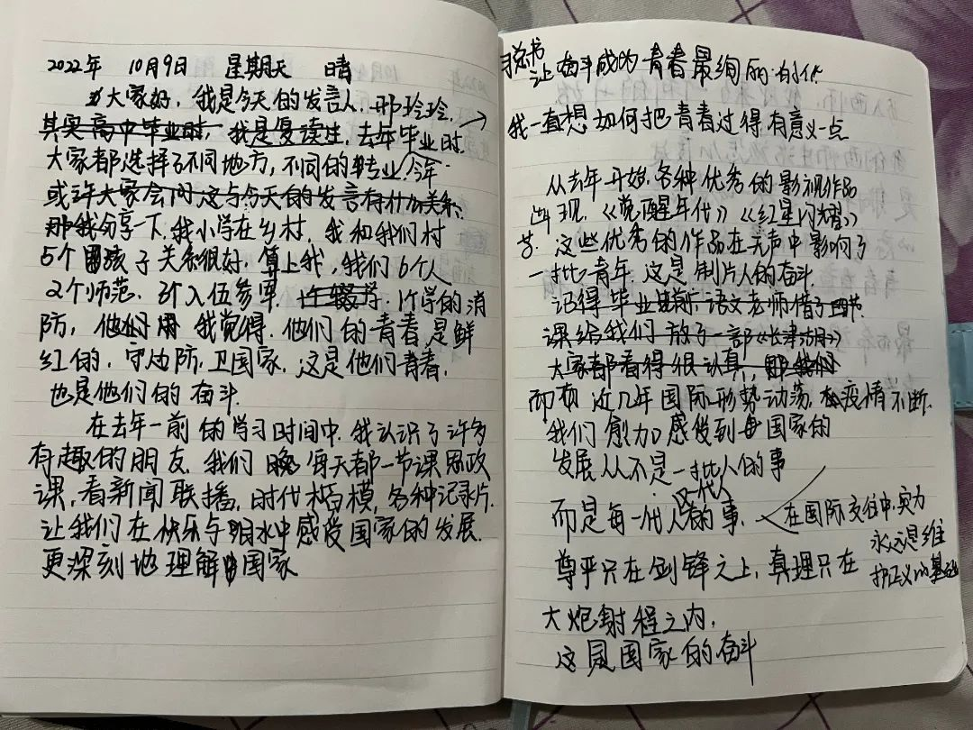 邢玲玲同学指出,近几年国际形势动荡,新冠疫情起伏反复,我们愈加感受到国家的发展不是一批人的事,而是一代又一代人的事。当代国际竞争的实质是以经济和科技实力为基础的综合国力的较量,“少年强则国强”,国家综合实力的提升,我们当代青年义不容辞。