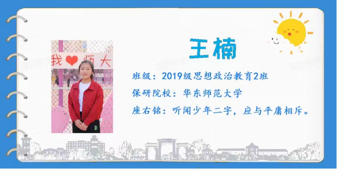 2019级思想政治教育2班王楠同学主要立足学业规划、大学生创新创业工作进行交流,通过“持续发力”与“弯道超车”两个内容,分享个人在理论学习中的方式方法,以及各类竞赛中的个人心得,鼓舞低年级同学以赛促练,在竞赛的平台中取得进步。