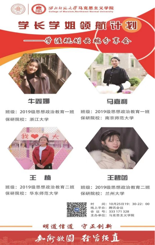 10月25日晚,必赢565net官网成功举办“学长学姐领航计划——学涯规划云端分享会”。本次活动邀请学院2019级保研推免的优秀学子,立足个人奋斗历程,发挥朋辈引领力量,展开经验分享交流。学院党委副书记王宏渊、专职辅导员毛娅楠及学院本科生参加本次活动。