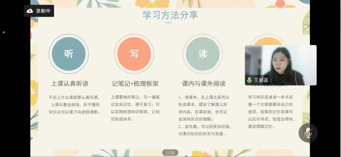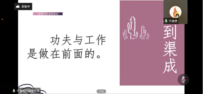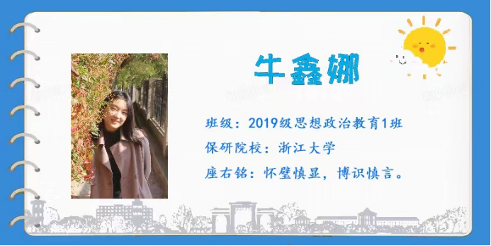 2019级思想政治教育1班牛鑫娜同学立足个人奋斗经历,围绕专业学习经验与从师技能提升,进行分享交流。她谈到同学们应把握思政专业特色,既注重夯实专业理论功底,也要不断提升从师技能水平,进而实现专业能力的全面发展。