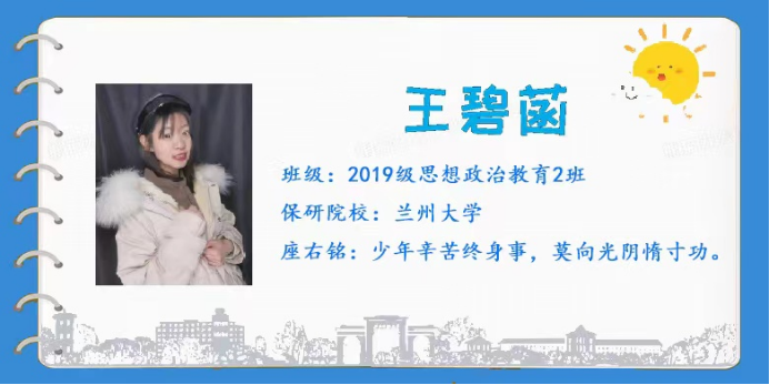 2019级思想政治教育2班王碧菡同学着重围绕保研事项和大学生宣讲工作展开介绍。通过对保研事项的具体说明,引导参会同学打好基础、拼搏进取。同时,对学院新时代大学生理论宣讲团相关工作进行介绍,鼓励低年级同学积极参与学院宣讲工作。
