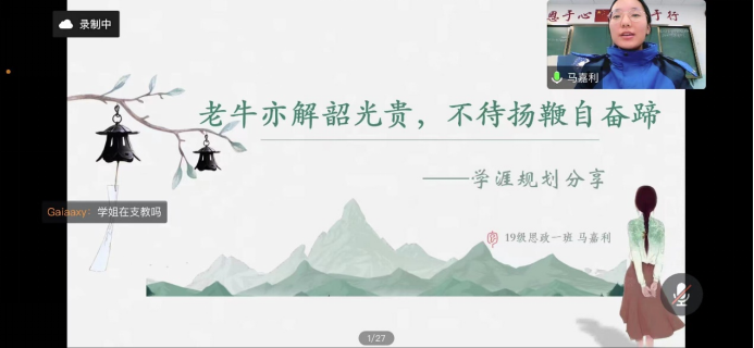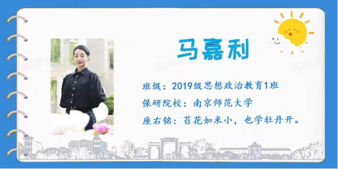 2019级思想政治教育1班马嘉利同学以专业学习规划、综合素质提升为主题展开分享,立足个人学习经历,鼓励低年级同学在理论学习中脚踏实地,稳扎稳打,夯实基础。同时,呼吁同学们积极参与实践活动,不断提升综合能力。