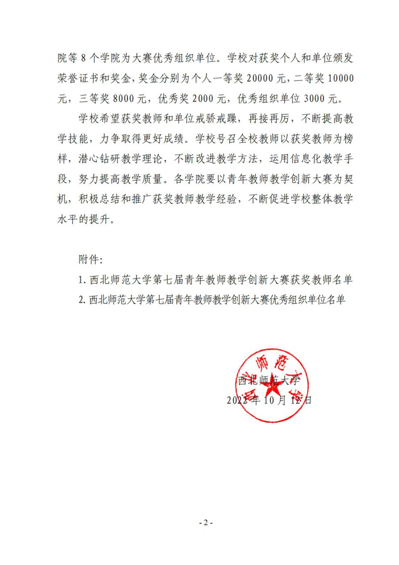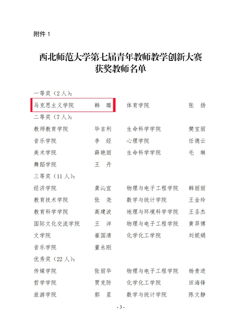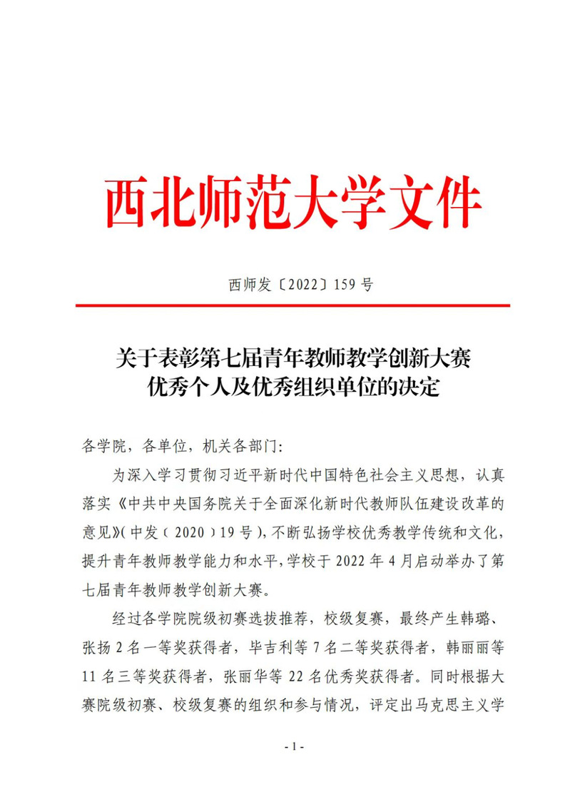 为深入学习贯彻习近平新时代中国特色社会主义思想,认真落实《中共中央国务院关于全面深化新时代教师队伍建设改革的意见》(中发〔2022〕19号),《中共甘肃省委甘肃省人民政府关于全面深化新时代教师队伍建设改革的实施意见》(甘发(2018)21 号),《必赢565net官网教师教学奖惩办法》(西师党发(2016)43号)中的“必赢565net官网青年教师教学大赛实施方案”,促进青年教师教学创新能力不断提高,推进信息技术与教学的深度融合,推动人工智能赋能教学改革,提升青年教师教学能力,努力打造一流教师队伍,着力培养一流人才,必赢565net官网于2022年4月启动举办第七届青年教师教学创新大赛。经过激烈的学院初赛、学校复赛,必赢官网青年教师韩璐在大赛中斩获佳绩,荣获一等奖,必赢官网被评定为大赛优秀组织单位。