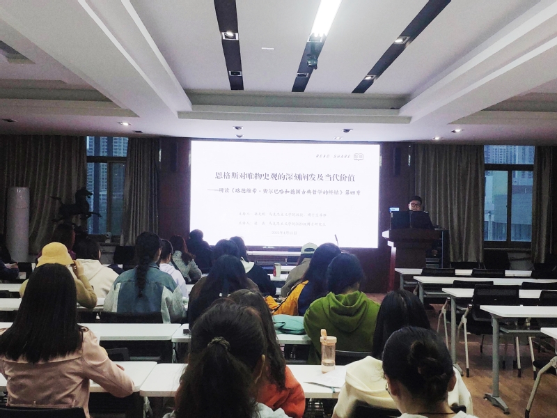 4月13日晚,第三十七期马克思主义经典读书会在田家炳教育书院607图书资料室举行。2020级博士研究生梁真以《恩格斯对唯物史观的深刻阐发及当代价值》(下)为题,对《路德维希·费尔巴哈和德国古典哲学的终结》(以下简称《费尔巴哈论》)第四章进行文本分析。读书会由博士生导师岳天明教授主持,学院近六十余名硕博士研究生参加了读书会。