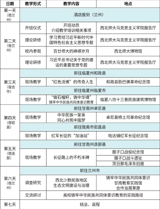 依托甘肃省红色文化资源优势,构建“革命传统教育+铸牢中华民族共同体意识教育+生态文明建设成就考 察”三维立体教学场域,组织参训学员开展主题式、沉浸式研修。实践研修路线包括兰州、白银、天水、陇南、临夏、甘南、张掖、武威等市州知名红色教育场馆和示范基地。