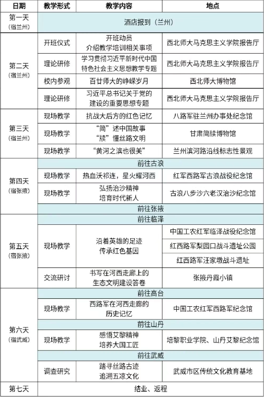 依托甘肃省红色文化资源优势,构建“革命传统教育+铸牢中华民族共同体意识教育+生态文明建设成就考 察”三维立体教学场域,组织参训学员开展主题式、沉浸式研修。实践研修路线包括兰州、白银、天水、陇南、临夏、甘南、张掖、武威等市州知名红色教育场馆和示范基地。