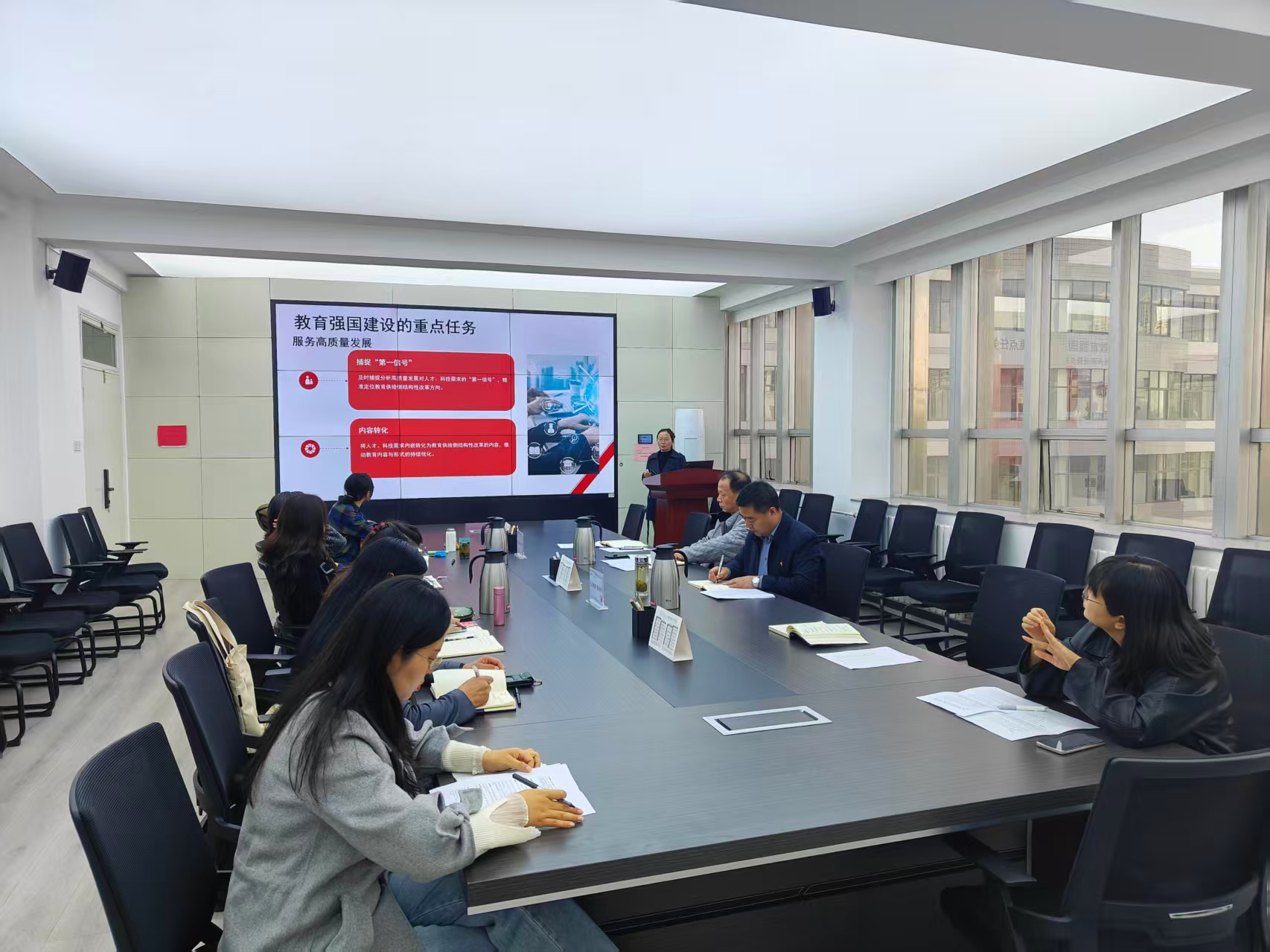 支部副书记王晓云对怀进鹏部长的辅导报告进行了系统梳理和要点解读,重点突出了报告对习近平总书记关于教育的重要论述的概括与阐释,以及对教育强国建设与中国式现代化内在逻辑的分析。