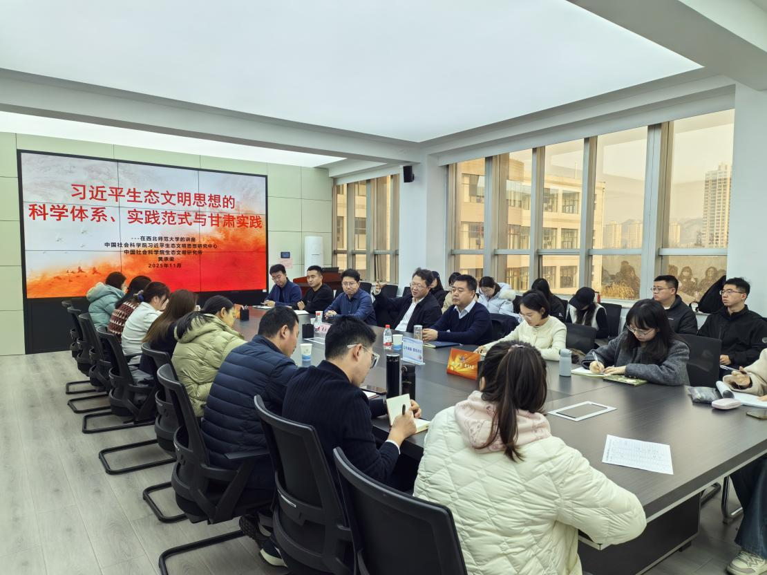 11月22日,学院邀请中国社会科学院生态文明研究智库理论部主任、习近平生态文明思想研究中心秘书长、生态文明研究所习近平生态文明思想研究室主任黄承梁作了题为《习近平生态文明思想的科学体系、实践范式与甘肃实践》的讲座,学院党委书记兼党委宣传部副部长郎得明主持活动,学院副院长周方和青年教师及硕博研究生代表参加。
